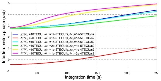Based on Equation (14), the relationships between the integration time and the interferometric phase under the different cases of the constant components, and the temporal first-order and the second-order derivatives of TEC with respect to the azimuth time, are shown in Figure 6. Firstly, under a specified TEC condition, the interferometric phase brought by the impacts of the temporal-spatial background ionosphere variation on GEO SAR increases when the integration time becomes longer. In additional, the tendencies of variations of the blue line and the red line with respect to the integration time in the figure are the same. Only the initial interferometric phase is different. Thus, the difference in the constant components of the TECs only gives rise to a fixed bias in the interferometric phase. In contrast, the variations of and have obvious impacts on the interferometric phase. Based on the changing tendencies of the blue line, the light blue line and the green line, it could be concluded that the interferometric phase decreases with the increase of under a specified integration time and . According to Equation (15), when is small, the product between and the integration time approximately dominates the phase error. Conversely, a larger will decrease the effect of the product between and the integration time on the phase error. As a result, the interferometric phase becomes insensitive to the variation of the integration time for a larger . As for , when is increasing, the interferometric phase becomes larger under a specified integration time and (the blue line, the yellow line and the purplish red line). In this case, the interferometric phase becomes more sensitive to the variation of the integration time.