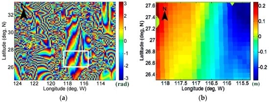 Utilizing the USTEC data in Figure 4 and Equation (14), the interferometric phase screen errors generated by and are shown in Figure 7a. The spatial distributed fringe frequency is brought by the interferometric phase screen ranges from less than one circle to multiple circles per one million square kilometers. Thus, the interferometric phase screen errors could give rise to deformation errors of up to several meters in the areas with dense fringes. We select the interferometric phase screen in the area marked by the white rectangle of Figure 7a, which has a relatively lower fringe frequency for the detailed deformation error analysis. The corresponding deformation retrieval error is given in Figure 7b. Even in the area with a lower fringe frequency, the largest deformation retrieval error in the scene is higher than 0.2 m and the mean square root error of the deformation is 0.13 m, which cannot satisfy the requirements for the deformation retrieval accuracy in any engineering applications. Therefore, some compensation algorithms based on Persistent Scatterer technology (PS) [4,33,34,35,36,37] or some similar methods based on the high quality coherent points are really needed to eliminate the serious impacts of the interferometric phase screen errors brought by the temporal-spatial background ionosphere variation in GEO D-InSAR processing in the future.