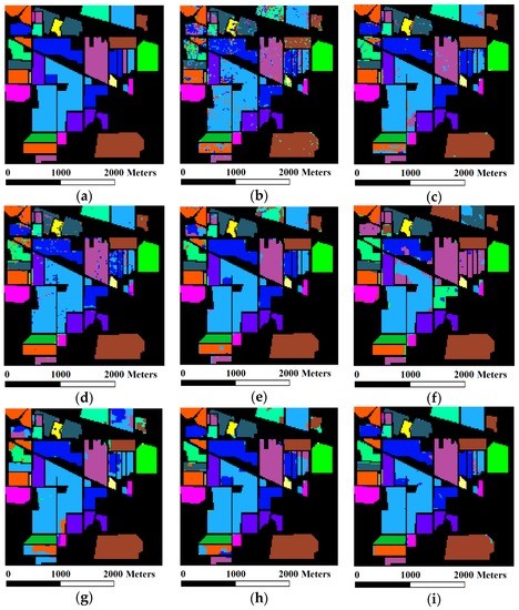 - The spectral-spatial extended EMP classifier [17]. The EMP was constructed based on the first three principal components of a hyperspectral image, a flat disk-shaped structuring element with radius from 1 to 17 with a step of 2, and the number of openings/closings is 8 for each principle component.