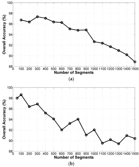 Evolution of the OA against the number of segments obtained by the ERS method on different images. (a) Indian pines; (b) University of Pavia.