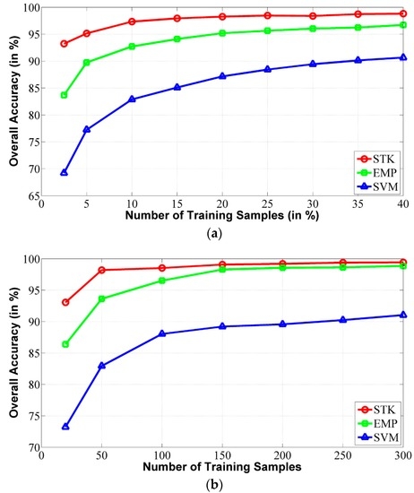 In this subsection, the influence of different number of training samples to the stability of the STK method is analyzed. Experiments were performed on the Indian Pines dataset and the University of Pavia dataset. In our experiments, the SVM, EMP and STK methods were used for comparison and the default parameter settings of these methods were fixed the same as the previous experiments in Section 4. The number of training samples for each class used by these methods increased from 2.5% to 40% for the Indian Pines image. Regarding the University of Pavia, the number of training samples for each class was set from 25 to 300. To accurately obtain the classification results, the OA values obtained by the three methods with different training samples were the average results over five trials. Figure 8 illustrates the evolution of the OA obtained by the STK method with different number of training samples for the two hyperspectral datasets. It can be noticed from this figure that the OA values achieved by the three classification methods were positively correlated with the number of training samples. Meanwhile, the STK method outperformed the other two methods with the same number of training samples for all of the two hyperspectral datasets. Moreover, our method can demonstrate outstanding performance in terms of the OA values when the number of training samples is considerably limited. For instance, with respect to the Indian Pines image, our method can obtain the OA value of 93.24% when the number of training samples is only 2.5% of the reference data. In contrast, it required more than 10% of the reference data for training for the EMP method to achieve an OA value higher than 93.24%. Moreover, the OA values obtained by the SVM method was much lower than that of our method, no matter how many training samples were used for classification. Regarding the University of Pavia image, it can be observed that, with only 50 training samples for each class (over 1% of the reference data), the STK method can obtain an OA value of 98.21%, which were much higher than that of the other two methods.