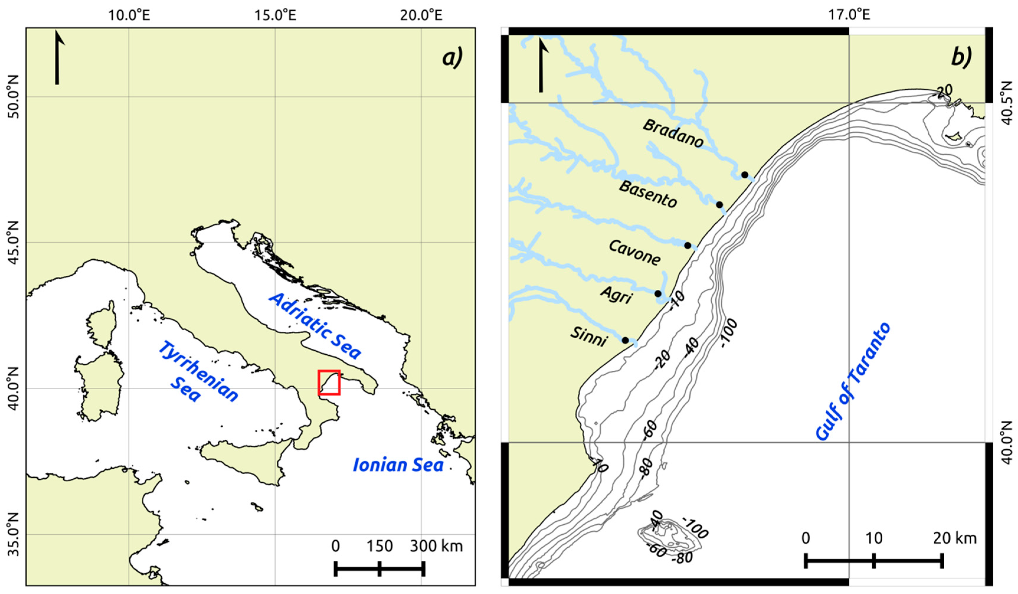 The Basilicata Region coastal waters (BRCW, Figure 1), located in the Ionian Sea (Mediterranean Sea), have been investigated in this work. The Basilicata region is situated in Southern Italy and its main rivers, all flowing into the Ionian Sea are, from N-E to S-W, the Bradano, Basento, Cavone, Agri, and Sinni.