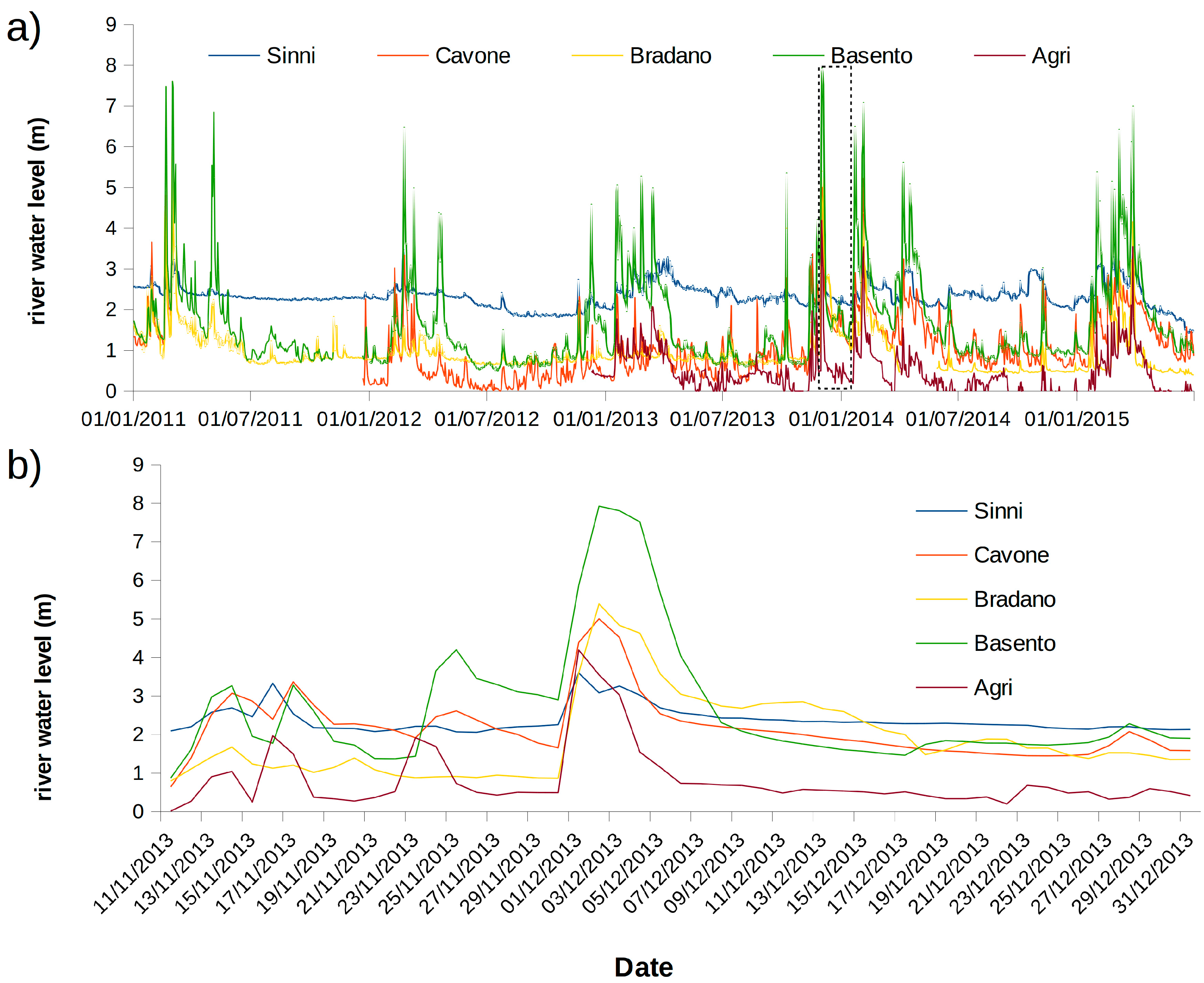 (a) Water levels measured at the five gauging stations closest to the Ionian Sea for the 1 January 2011–30 June 2015 period. For the Cavone river data are missing from 1 March 2011 to 1 January 2012, while for the Agri river the measurements started from 1 January 2013. (b) Magnification on the 1 November 2013–31 December 2013 period, within the black dashed rectangle in (a).