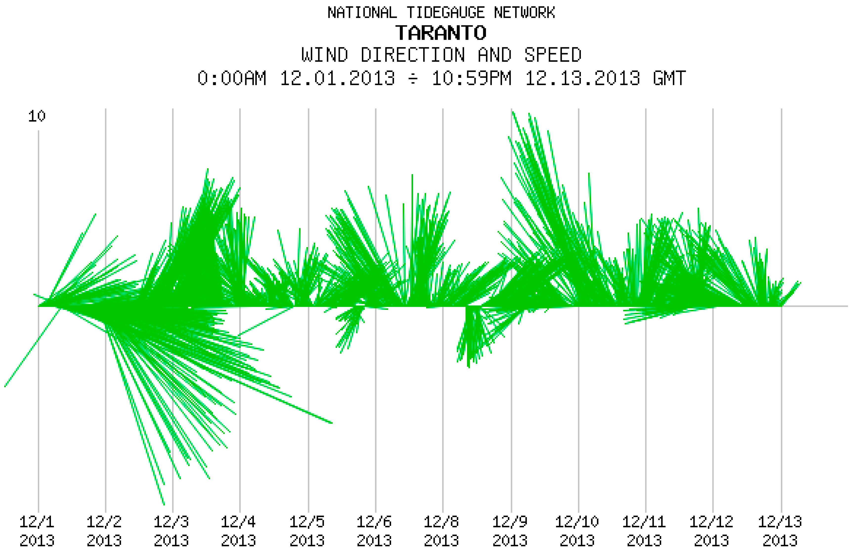 The registered wind intensity (m/s) and direction measured every 10 min in the 1–13 December 2013 period at the Taranto station (data from [35]).