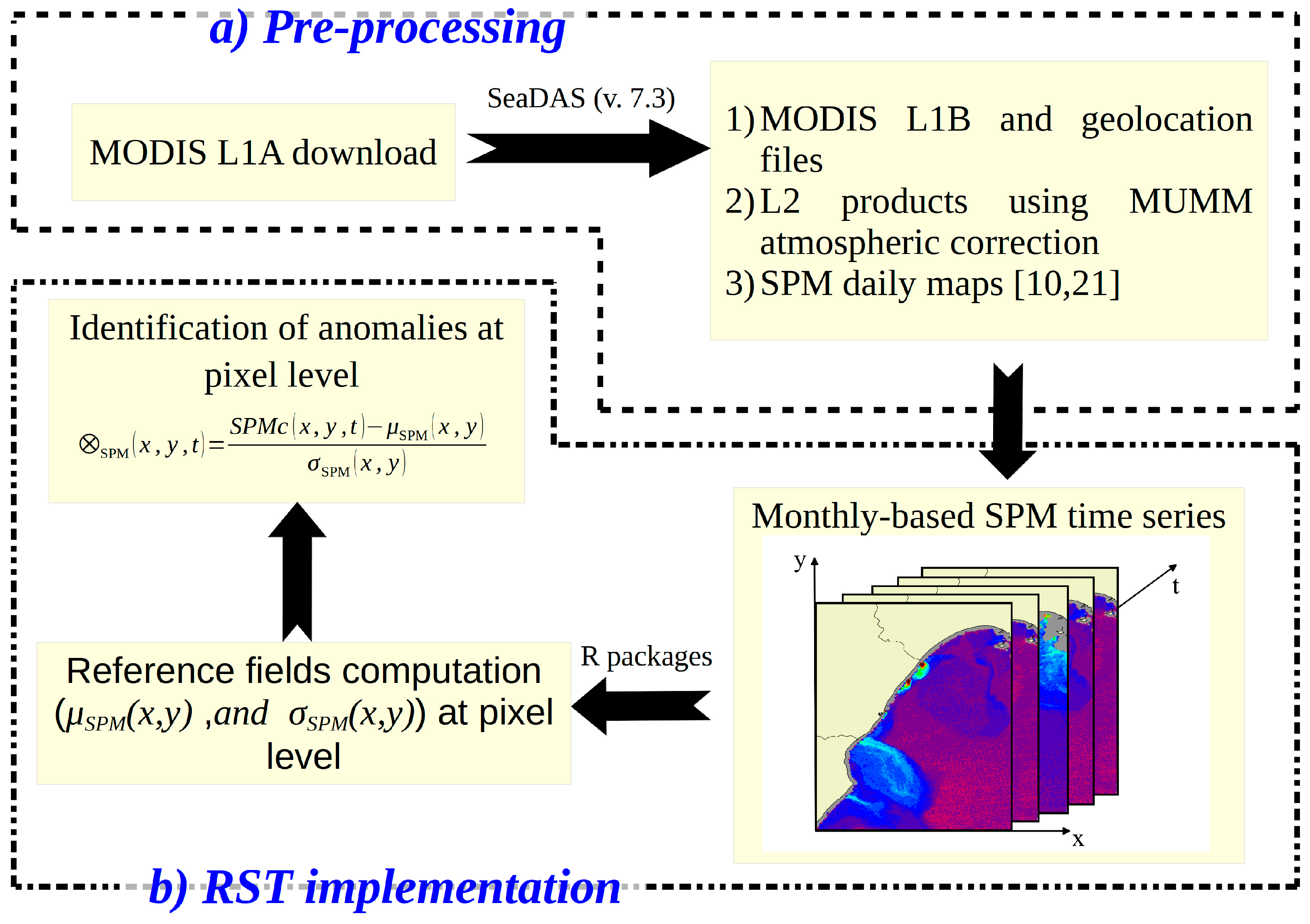 Flowchart of the various steps of elaboration. (a) Pre-processing of the MODIS L1A data to obtain SPM daily maps; (b) main steps of RST implementation.