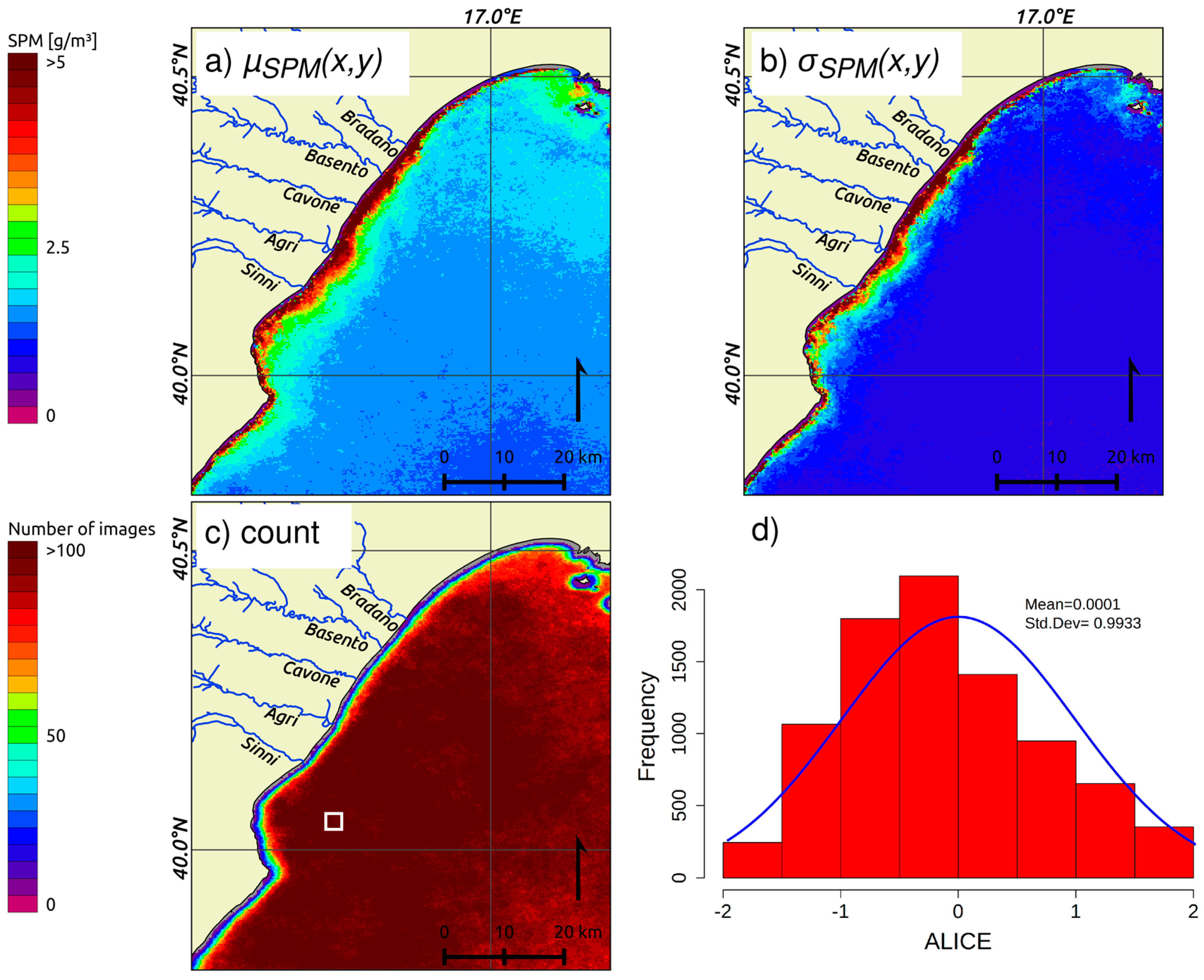 where SPMc(x, y, t) is the SPM concentration at location (x, y) and time t, μSPM(x, y) and σSPM(x, y) are the interannual reference fields representing the unperturbed conditions and the normal variability at pixel level. Both reference fields were computed using time series of the daily MODIS-SPMc maps for the month of December for the years 2003–2015, obtained applying the approach suggested in the previous steps (Section 3.1, Figure 4a). For each pixel of the study area an iterative kσ procedure [25] was implemented to exclude outliers, to make the reference fields actually representative of unperturbed conditions. About 500 MODIS-Aqua images recorded in December were collected, including those only partially covering the BRCW, to produce the reference fields, which are shown in Figure 5a,b. While processing the images, for each of them, the pixels affected by clouds, sun glint, or large satellite zenith angle were discarded from further analysis. Figure 5c shows that for many pixels in the area more than 100 records (survived to the above mentioned discarding procedure) were used for computing μSPM(x, y) and σSPM(x, y), with a median value of ~92 useful record per pixel over the whole area. Such a number has been found to be, by an independent study applied on RST approach [44], high enough to be representative of the investigated long-term time-series signal. The identification of cloudy pixels has been performed using data acquired in the SWIR bands [45]. After testing various thresholds, we used a value of 0.012 on the Rayleigh-corrected reflectance (c = TOA − r) 2130 nm SWIR band for detecting cloudy pixels. It is worth mentioning that a smaller number of images was used for computing the reference fields close to the coastline, compared to the other pixels of the study area. The sub-pixel effect due to the presence of a water-land mixed signal might produce a failure of atmospheric correction, especially for off-nadir acquisitions, making the SPM retrieval impossible in these areas.