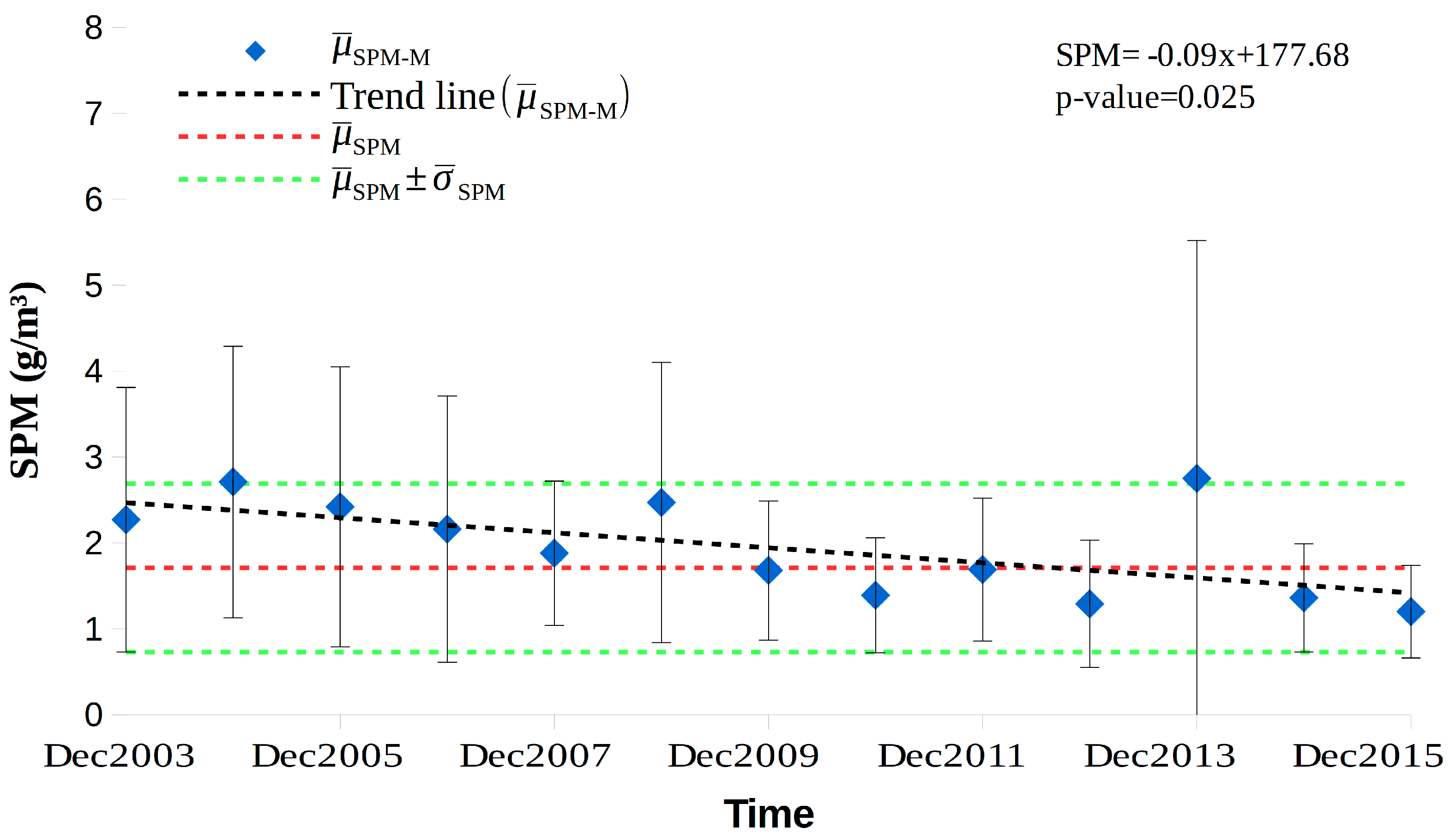 Trend of SPMc monthly mean spatially averaged over BRCW for the months of December from 2003 to 2015 (, blue rhombus) compared with the interannual mean (, dashed red line) and interannual mean ± standard deviation ( ± , dashed green line). The vertical error bar associated at each year represents the annual standard deviation spatially averaged over BRCW. The dashed black line indicates the trend line of the monthly SPMc mean for December.