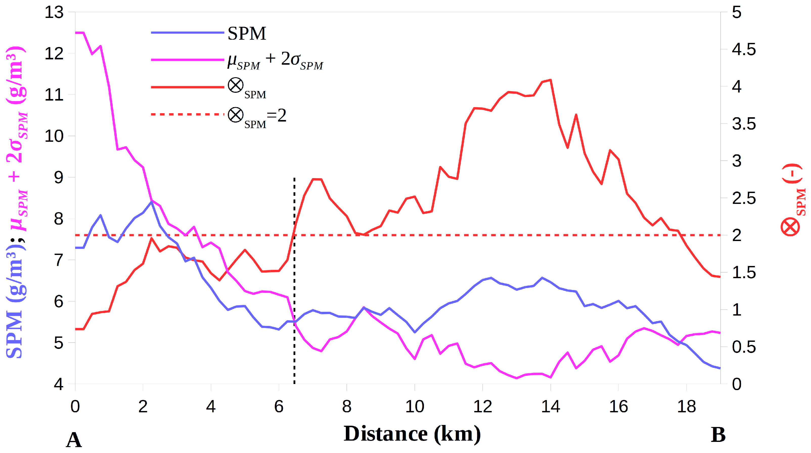 Although Figure 7 and Figure 8 highlight similar SPMc features, the results reported in these two figures are supplementary. Figure 7a shows where high absolute SPMc values are located, but without any knowledge about the history of the area at pixel level, it is difficult to attribute a significance to these SPMc values. On the other hand, RST allows us to identify areas with SPMc values significantly higher than the value observed in normal conditions, taking also into account the signal variability (standard deviation). Therefore, the same SPMc absolute value can generate very different ⊗SPM(x, y, t) magnitudes. To better understand the differences between the anomalies obtained computing ⊗SPM(x, y, t) and the SPMc values, the signal profiles along the A-B transect in Figure 7c and Figure 8c are reported in Figure 9. In detail, in this figure, the ⊗SPM(x, y, t) variation is depicted in red and the SPMc one in blue. The purple line provides the value of SPM temporal mean plus two times the standard deviation (i.e., μSPM(x, y) + 2 × σSPM(x, y)) for each pixel of the profile investigated. Moreover, the red dashed line indicates the ⊗SPM(x, y, t) threshold of 2. In the first part of the transect (up to 6.5 km, highlighted by the black dashed vertical line in Figure 9), the SPMc (blue line) is quite high but never higher than the (μSPM(x, y) + 2 × σSPM(x, y)) value (purple line) so that no anomaly is detected. In this first portion, SPMc and its variability (and therefore μSPM(x, y) and σSPM(x, y)) are normally higher than in the remaining part because of the proximity to the coastline and river mouths, which makes those areas usually affected by high mean and variability values. Moving on the right side of the black dashed line, even if SPMc is lower than in the first portion of the transect, it is high enough to be greater than (μSPM(x, y) + 2 × σSPM(x, y)) (sometimes also higher than 3 × σSPM(x, y)). Hence, statistically significant ⊗SPM(x, y, t) values are obtained, indicating that for the period and location analyzed anomalous SPMc is detected.
