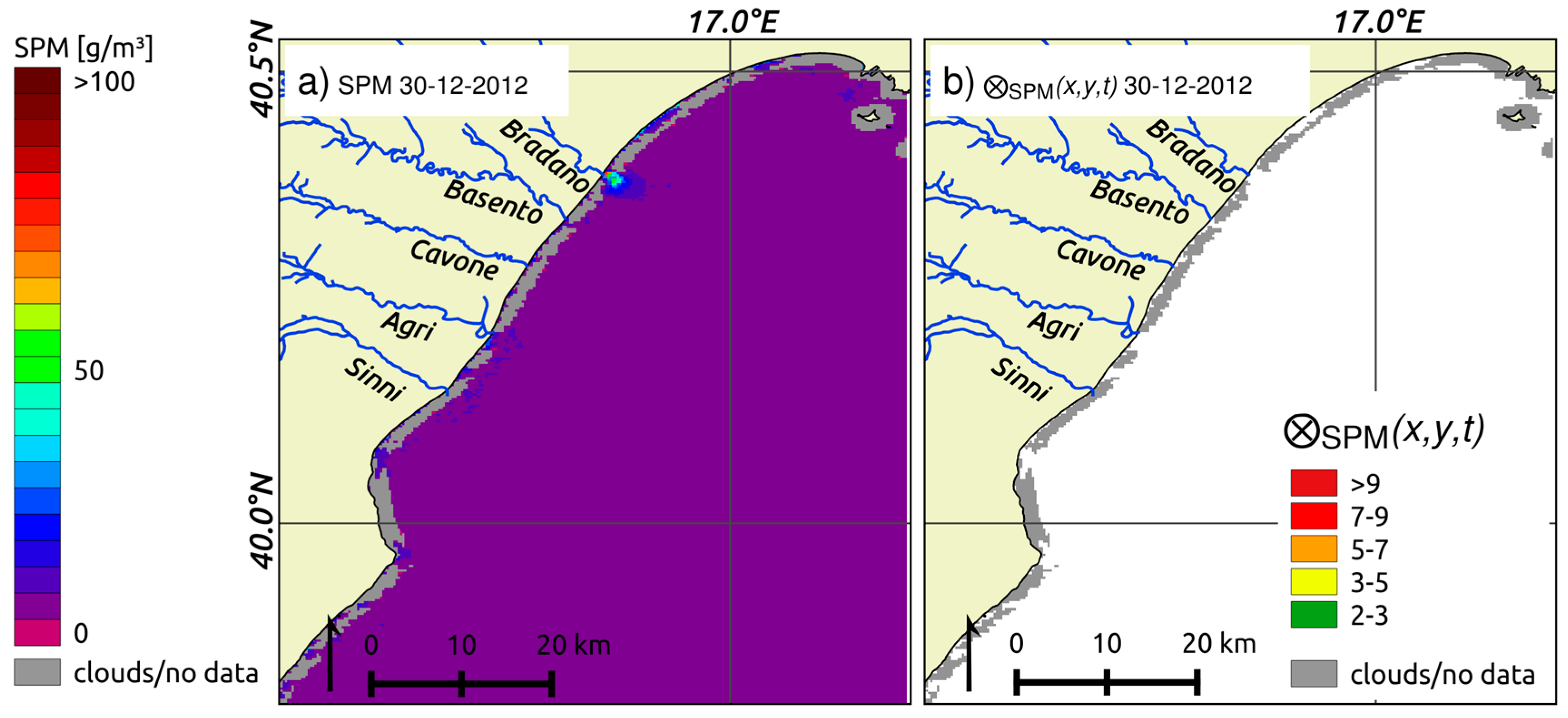 The analysis for a day of low SPMc was also conducted to assess RST performances in case of normal river discharges. The scope of this analysis is to show that no “false positive” value is detected in case of low/normal SPMc. This assessment was carried out on 13 December 2013, when the rivers outflowing in BRCW were no longer affected by the flood episode of the early December 2013 (Figure 2b). In detail, the mean rivers level was 2.22 m, well below those recorded on the three days already analyzed in Section 4.2 (5.21 m for 4 December 2013, 4.43 m for 5 December 2013 and 3.73 m for 6 December 2013). SPM concentrations for this day are lower than 10 g/m³ in almost all the BRCW, with the highest values (the SPMc values do not exceed 50 g/m3) obtained at the Bradano mouth (Figure 10a). Results obtained applying RST for the same day show no significant anomaly—⊗SPM(x, y, t) < 2 —(Figure 10b). Neither are anomalies detected at the Bradano mouth where the highest SPMc values are registered. This is because the computed SPMc is in the normal range of values and variability for that specific area and period of the year. As the river levels recorded on 13 December are not affected by high river water level (Figure 2b), this result confirms once again the ability and the robustness of the RST approach to detect only the pixels affected by anomalous SPMc values.