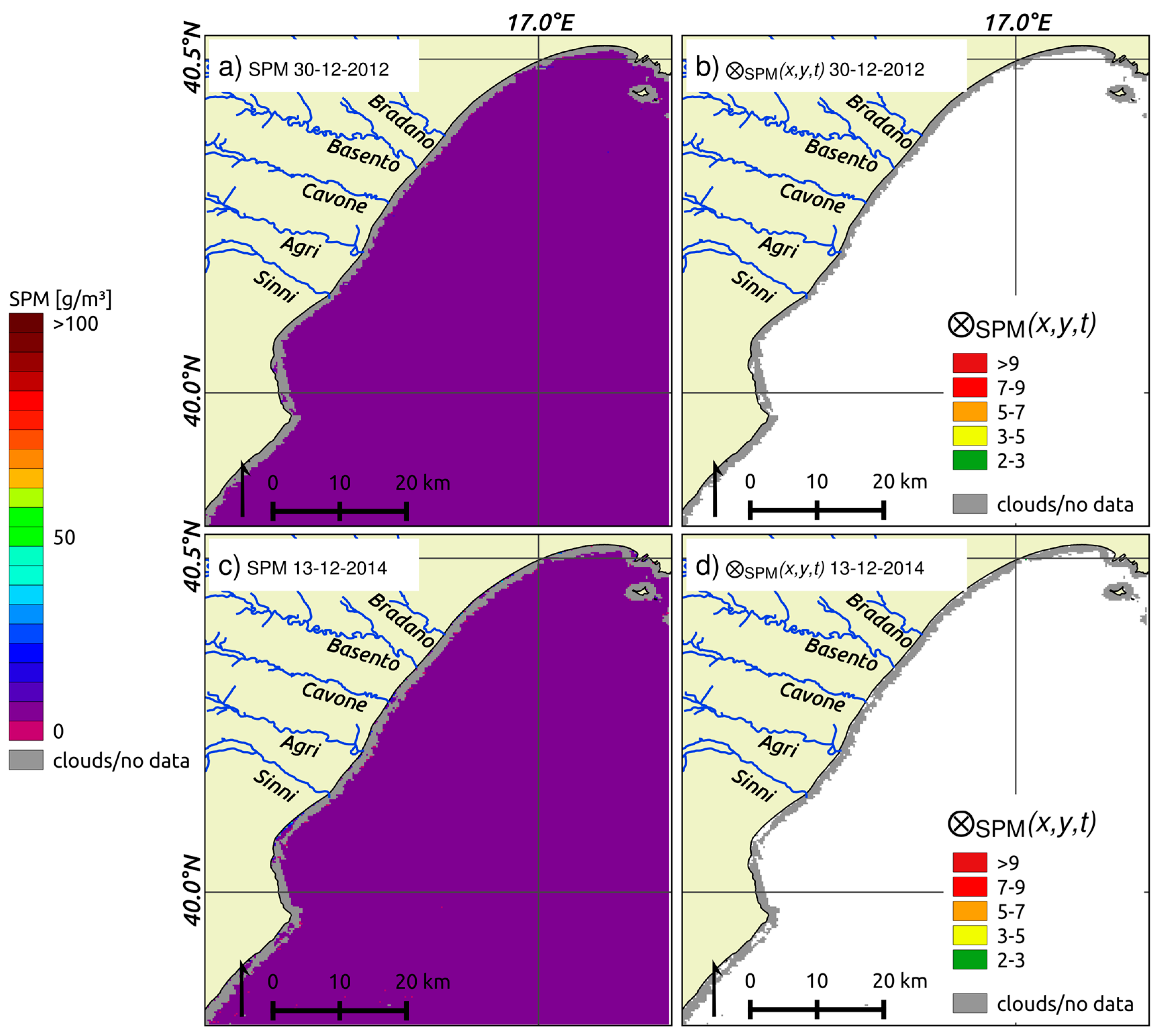 Here we analyze the results obtained for the extreme hydrological event affected the Basilicata region in December 2013. SPMc maps were computed by applying the combined approach described in Section 3.1, then the RST-based Equation (5) was applied to these data. It is worth noting that the first MODIS-Aqua cloud-free image over the BRCW related to the event was acquired on 4 December 2013 at 12:25 GMT, therefore with a three-day time lag since the maximum water level was registered at the Agri and Sinni stations, and a two-day time lag since that measured at the Basento, Bradano and Cavone (see Section 2 and Figure 2b).