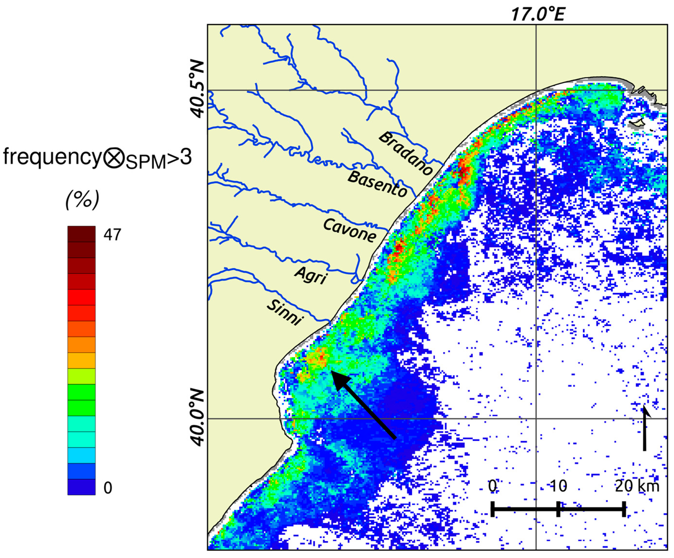 The RST-based analysis performed at daily scale to study the December 2013 event was extended to the whole December 2003–2015 dataset to identify the BRCW areas most seriously affected by anomalous SPMc values. To this aim ⊗SPM(x, y, t) was computed all over the time period considered, and the ⊗SPM(x, y, t) > 3 occurrence frequency was computed for each pixel of the study area. Results are reported in Figure 12 in terms of percentage of occurrence with respect to the total images considered for the reference field computation at pixel level (Figure 5c). Besides some spurious and isolated pixels far from the coast, the higher frequency of occurrence was found near the coast, with a pattern very similar to that obtained studying the December 2013 event. Orange-red pixels in Figure 12 highlight those pixels where [frequency⊗SPM(x, y, t) < 3] is higher than 20%, which are mainly located in front of the Bradano, Basento and Cavone river mouths. Another area of persistence, located South of the Sinni mouth (black arrow in Figure 12), does not seem to be directly connected to any river mouth and is likely to correspond to an SPM accumulation due to the currents or resuspension phenomena. The dispersion direction of each river plume is also observable—the Bradano, Basento and Cavone plumes follow the North-East/South-West direction, while the Agri and Sinni plumes are hardly distinguishable. The highest ⊗SPM(x, y, t) > 3 occurrence frequency was found in front of the Bradano river mouth (47%). On the other hand, an area with a low frequency of SPMc anomaly occurrence is located in front of the Agri mouth, in agreement with the river levels measured.