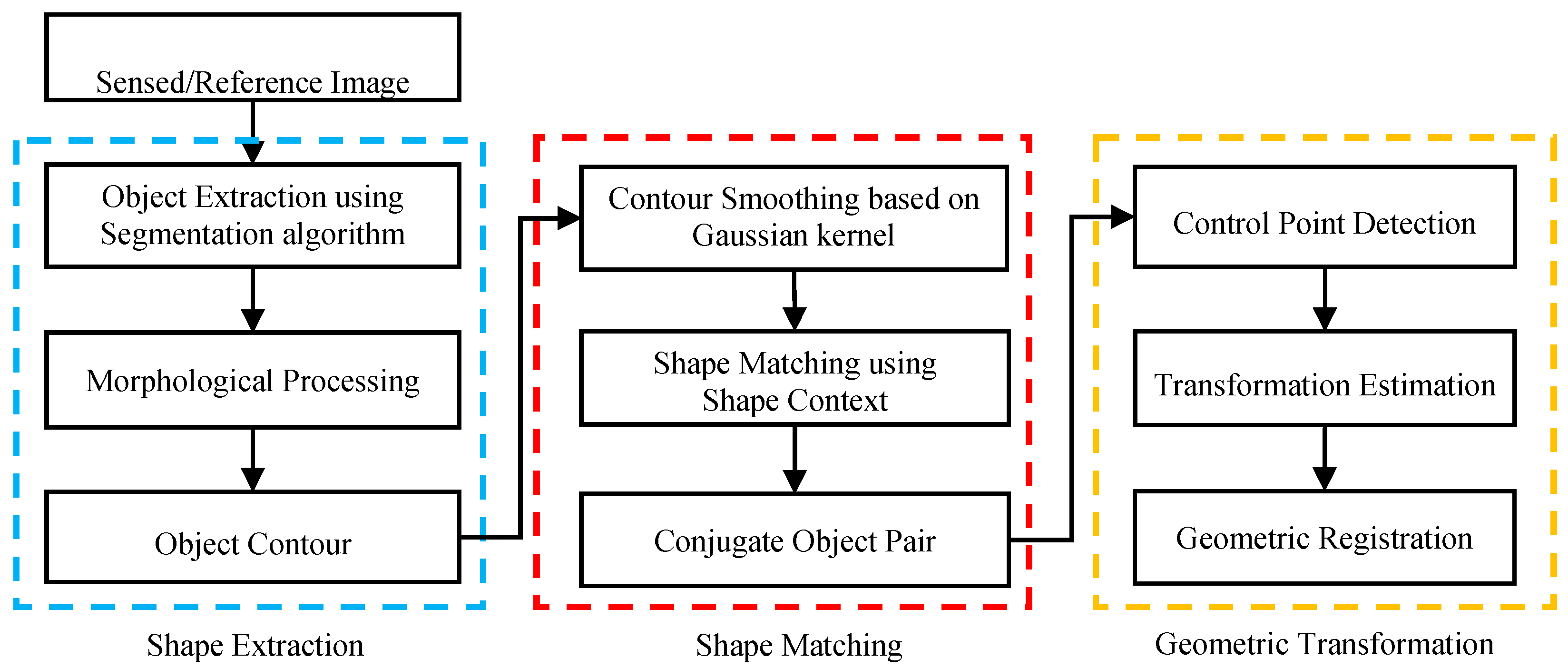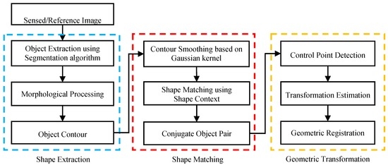 (1) Shape extraction. First, distinct ground objects (e.g., lake, vegetation) are extracted from reference and sensed images. Applicable segmentation algorithms and parameters should be used for these different objects respectively. Morphological processing and data vectorization will be used to obtain the contours of the objects (shapes).