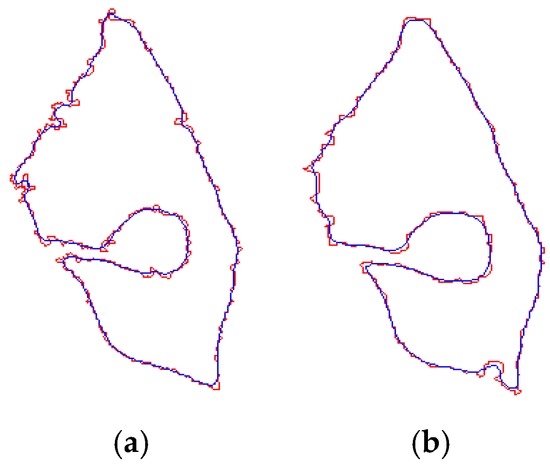 Curve smoothing for two different shapes. (a) Shape A, (b) Shape B. The red line is the original contour, and the blue line is the Gaussian smoothing result.