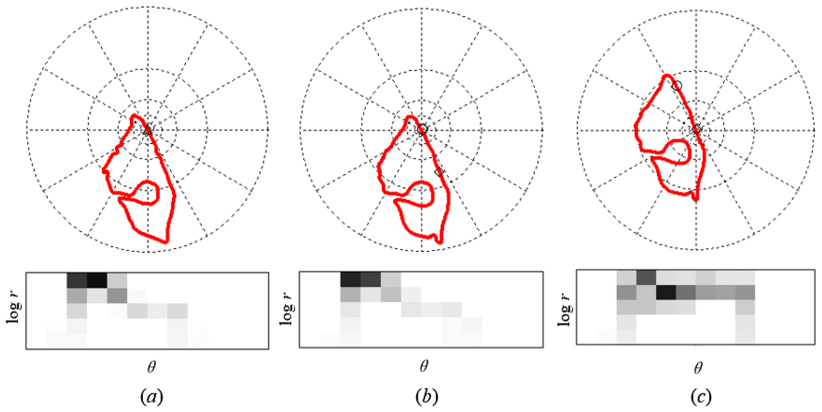 Sampled edge points of two shapes and example histograms of the shape contexts. (a) Example shape context for shape A is marked by△. Example (b) and (c) shape contexts for shape B are marked by ○ and ◇. Each shape context is a log-polar histogram of the coordinates of the rest of the point set, measured using the reference point as the origin. (Dark = large value). Note the visual similarities of the shape contexts for △ and ○, which were computed for relatively similar points on the two shapes. However, the shape context for ◇ is quite different.