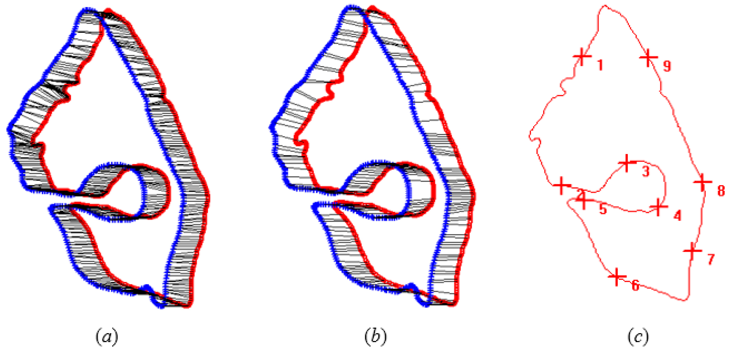 Shape context matching and control point (CP) selection: (a) the matching point from shape A to shape B; (b) correspondences between the best match pairs, wherein the costs are minimal for the two shapes; (c) CPs selected and uniformly distributed on the best match pairs.