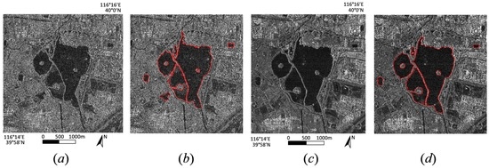 (a–d) SAR images and extracted contours: (a) Radarsat-2 image, (c) TerraSAR-X image; (b) and (d) are extracted contours of (a) and (c).