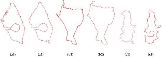 After image segmentation, the filling of holes, the removal of small objects and contour vectorization are necessary to get applicable object shapes. In these procedures, appropriate morphological processing (e.g., erosion, dilation, opening, closing, and boundary) will be used. The contours extracted from the images are shown in Figure 5b,d. The contours in different images are not completely coincidental and have local differences for various reasons, e.g., imaging conditions, object changes, occlusion, and segmentation technology. The example can be shown in Figure 6.