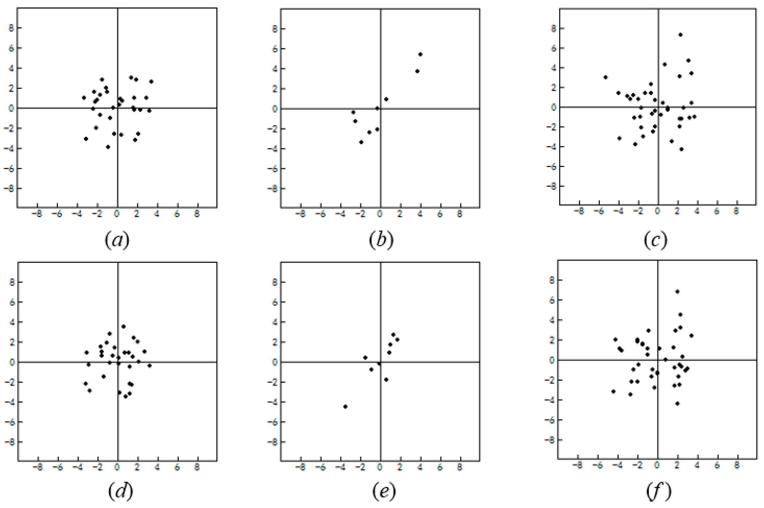 Check point residuals. The first and second rows correspond to 1st-order and 2nd-order polynomial models, respectively. Left (a) and (d) SC, middle (b) and (e) SIFT, right (c) and (f) SC+SIFT.