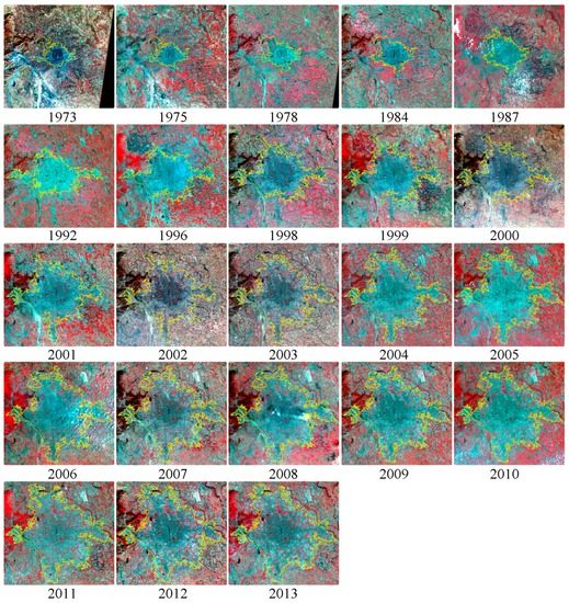 All data processing was performed on the Modular GIS Environment (MGE) platform, which was developed by the Intergraph Company of America and had strong image processing functions [42]. First, to ensure the extraction accuracy of urban information, images were selected with the time phase of vigorous vegetation growth and less than 10% cloud cover [43]. Afterwards, all images were pre-processed by three steps on the MGE platform, including band composition by using standard false-color synthesis [40], band enhancement using linear contrast stretching and histogram equalization [44], and rectifying all images to a common Albers equal area conic (ALBERS) coordinate system based on 1:100,000 topographic maps of China. The accuracy of geometric rectification in terms of relative position error for the same feature point did not exceed two pixels (60 m) [45]. Finally, based on the established interpretation symbols of urban lands, researchers with professional knowledge and experience reconstructed the urban expansion process of 31 cities by using the visual interpretation method referring to Google Earth and topographic maps. Regarding the accuracy of mapping methods elaborated by Zhang et al. [2], the extraction standard of the National Land-Use Change Database of China (NLUD-C) was used to ensure the accuracy of urban expansion monitoring above 90% [15]. Using Beijing as an example, Figure 2 shows us how obvious urban expansion was during the period from 1973–2013 by analyzing remotely sensed imagery, and Figure 3 describes the urban expansion monitoring process during that period.
