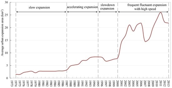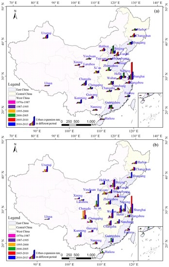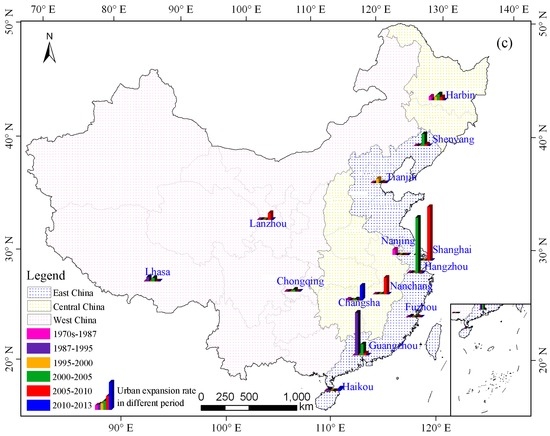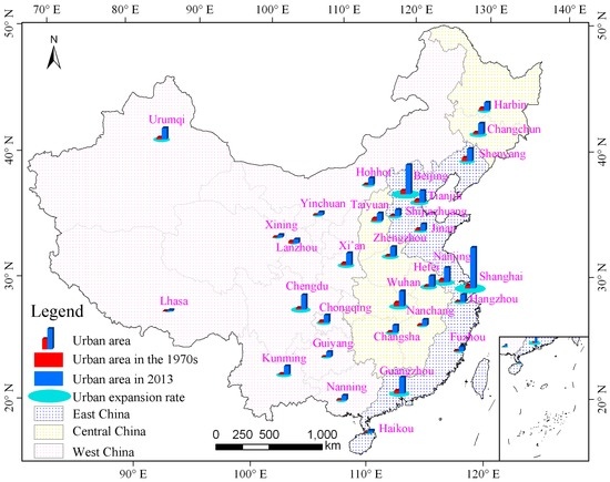 - Urban expansion processes were closely related to national macro policies. Since the 1970s, urban lands in municipalities and provincial capitals in China have expanded dramatically from 2582.38 km2 in the 1970s to 15,801.57 km2 in 2013. Four urban expansion stages occurred successively, i.e., a slow expansion period from the 1970s–1987, an accelerating expansion period from 1987–1995, a slowdown expansion period from 1995–2000, and a fluctuating expansion period with a high rate after 2000. Urban expansion exhibited an apparent spatial difference. The expansion rate of cities in East China was fastest, followed by that of cities in Central China. The urban expansion rate was slowest in West China.
