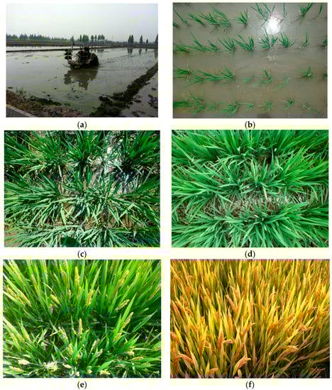 The single-cropped rice calendar in Deqing County, Zhejiang Province, China: (a) machinery transplants rice seedlings, 21 June 2012; (b) tillering period, about two weeks after transplanting; (c) the tillering period reached the maximum tiller number on 30 July 2012; (d) ear differentiation period, 15 August 2012; (e) heading period, flowering, 31 August 2012; (f) ripening stage, ready to be harvested, 18 November 2012. Photos (a–f) were taken at the same rice sample plot, as there were several rice varieties planted, but the start date of each period is different.