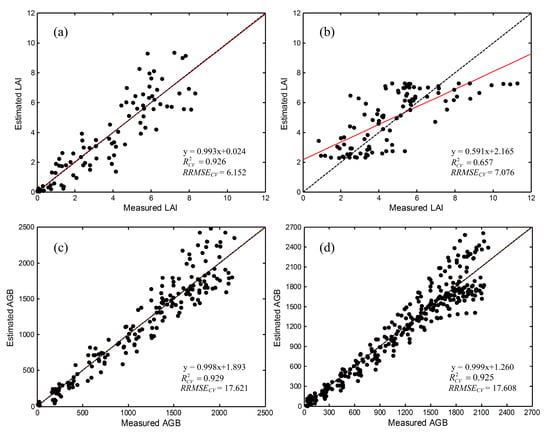 Relationships between measured rice leaf area index (m2/m2) and dry aboveground biomass (g/m2) at different rice growth stages with VIs. (a) Before heading LAI estimation using EVI2-BPNN regression; (b) after heading LAI estimation using NDVI-SVM regression; (c) all-growth stage AGB estimation using daily cumulative NDVI and based on the quadratic polynomial fit function; (d) all-growth stage AGB estimation using 10-day composite data and based on the cumulative NDVI quadratic polynomial fit function. The black dash lines are the 45° lines, and the red solid lines are the linear regression trend lines.