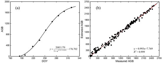 Dynamic curves of rice dry aboveground biomass (g/m2) based on logarithmic equations: (a) logarithmic curve of one sample plot in 2013; (b) comparison of measured aboveground biomass with estimated values of all the sample plots during 2012–2013 (n = 194). The black curve is the best-fit function for in situ AGB estimation, the black dashed line is the 45° line, and the red solid line is the linear regression trend line.