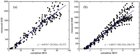 Regression analysis of HJ-1 CCD cumulative VIs versus dry aboveground biomass (g/m2) using a quadratic polynomial fit function: (a) daily cumulative NDVI function and (b) 10-day composite data based on cumulative NDVI function. The blue solid lines are the regression trend lines.
