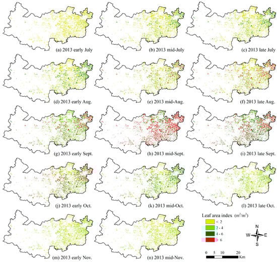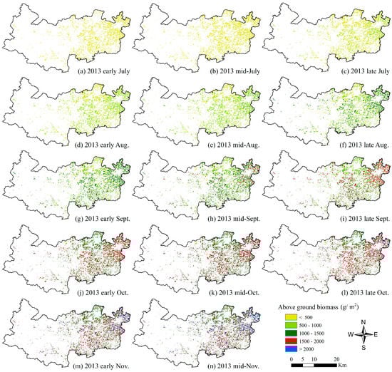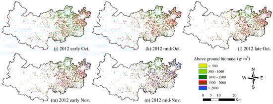 The dynamic maps of SCR growth conditions in Deqing County are presented in Figure 7, Figure 8, Figure 9 and Figure 10. The composite VI images represent the highest value of each pixel during the 10 days, and estimated the SCR growth conditions three times a month for field level practices. The dynamic mapping can realize the near real-time observation at a regional scale with satisfactory precision. At different years, there is an observed variation in modeled LAI values at the corresponding time. For example, in mid-July 2013, SCR showed a higher LAI value compared with that observed at the same time in 2012 (Figure 7b and Figure 8b), which may be caused by slight differences in the transplanting or sowing dates (compared with 2012). Both years showed a peak LAI value at the start of the reproductive stage, and after the heading stage the LAI dropped due to etiolation and leaf senescence. In mid-November, many fields were harvested and LAI values were relatively low (Figure 7m,n and Figure 8m,n). The dry AGB of rice showed continuous increase during the growth period (Figure 9 and Figure 10). Different colors represent different ranges of AGB values, and could provide information for field managers and policymakers at regional scales. The overall system of dynamic mapping is shown in Figure 11. The specific processes were integrated in the MATLAB program.