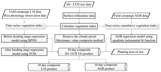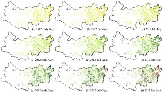 The cloudy pixels were flagged by a threshold value of 0.25 for the red band of HJ-1 CCD data. The MVC method can further help in the removal of contaminated pixels [55,56]. New 10-day composite HJ-1 CCD data were then acquired three times a month for estimating local SCR growth parameters. In the rice growth monitoring and dynamic mapping system, EVI2-BPNN regression is selected for before heading LAI estimation; NDVI-SVM is selected for after heading LAI estimation; cumulative NDVI based on the quadratic polynomial fit function was adopted for the all-stage AGB prediction. The values were 0.93, 0.66, and 0.93, respectively. With this method, rice growth conditions can be visually captured at the regional scale, which will help users compare the overall condition of crops through different growth stages within one year or different years in the same growth stage.