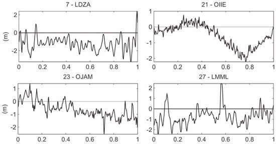 A graph of elevation differences of the WorldDEM™ minus runway profiles along the center line of the runway at Zagreb Airport (LDZA), Croatia, Teheran Int. Airport (OIIE), Iran, Amman Civil Airport (OJAM), Jordan, and Luqa Int. Airport (LMML), Malta, ID = 7, 21, 23 and 27 in Table 2, respectively). Note the normalized length of the runway.