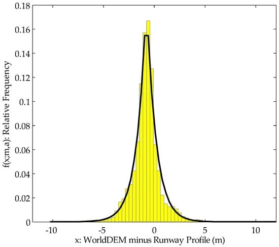 Figure 3 shows a histogram of the differences of the WorldDEM™ minus the corresponding ‘as constructed’ runway profiles for 47 airports. In addition, the Laplace probability density function is shown. It appears that there is a close match between the histogram and the Laplace probability density function (pdf). The parameters of the pdf, i.e., m = −0.79 m and a = 0.93 m, were estimated using the 23,500 height differences.