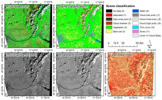 Examples of a Sentinel-2 100 × 100 km2 images (tile 33UXP, covering the region between Vienna and Bratislava, acquired on 6 May 2016) and value-added products available at the data service platform. Note that clouds extracted from the Level-1C cloud mask are displayed (as hashed symbol) in all other products. (a) RGB false color composite; (b) Scene classification; (c) Individual band; (d) Broadband hemispherical-directional reflectance factor (HDRF); (e) Leaf Area Index.