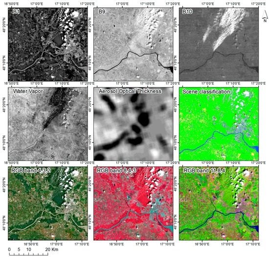 Examples of 60 m spatial resolution bands B1 (443 nm), B9 (940 nm), and B10 (1375 nm) dedicated to atmospheric correction and cirrus cloud detection (Sentinel-2 image subset acquired on 22 June 2016) and retrieved water vapor (WV) and aerosol optical thickness (AOT). On the bottom row, examples of true and false color RGB composites produced for the same acquisition are shown. The legend for the scene classification is given in Figure 1.