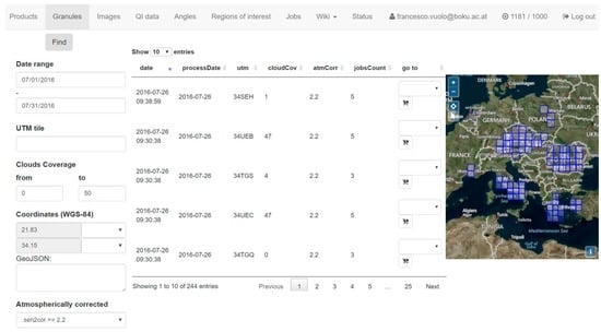 The web interface allows users to search for products (defined as the collection of elementary granules within a single orbit), granules (the 100 × 100 km2 image tiles) and images (image files of an individual granule, such as spectral bands or value-added products). The search can be filtered considering a range of acquisition dates, maximum cloud cover, and a set of coordinates (center point or using a GeoJSON string to define a point, bounding box or polygon). The metadata catalogue is regularly updated as new products are pulled from the national mirror sites and archived at EODC. From the user perspective, major performance improvements in data search are related to the use of (i) the actual geometry of valid data in the Sentinel-2 granules and (ii) an area-based cloud cover statistic (using the Level 1C cloud mask) instead of the “bulk” cloud cover percentage provided with the image metadata.