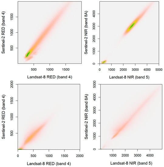 Scatterplots between BoA Landsat-8 and Sentinel-2 reflectance in red and near-infrared for two test sites (top row: Greece, 8 August 2015 tile 34SEH; bottom row: Austria, 31 December 2015, tile 33UUP). The reflectance from Sentinel-2 at 10 m spatial resolution was averaged within a buffer of 30 m to match the pixel size of Landsat-8. BoA reflectance values are scaled by 10,000.