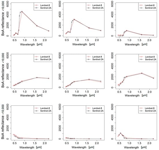 Figure 5 shows some exemplary spectral profiles from atmospherically-corrected Landsat-8 and Sentinel-2 pixels acquired on the same date. The spectral profiles represent different land cover types including vegetation, soil, and water. They show a very good match over the six homologue spectral bands.