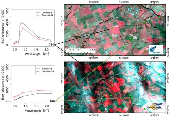 Examples of comparison between BoA Landsat-8 and Sentinel-2 reflectance for randomly-selected points (including vegetation, soil and water). The images were acquired on the same day. The reflectance from Sentinel-2 at 10 m spatial resolution was averaged within a buffer of 30 m to match the pixel size of Landsat-8. BoA reflectance values are scaled by 10,000.