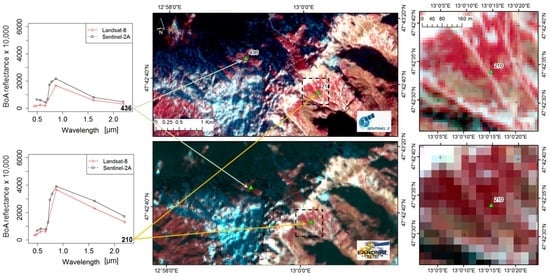 Spectral mismatch between Landsat-8 and Sentinel-2 observed over heterogeneous and complex surface terrain. The maps on the right show a zoom in on point “210”. BoA reflectance values are scaled by 10,000.