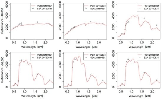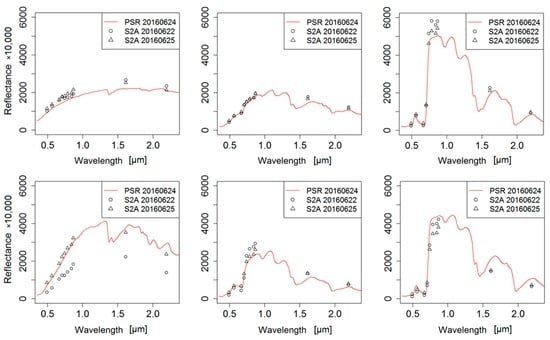 Comparison between field spectral measurements on 24 June and Sentinel-2 data acquired on 22 June and 25 June 2016 over an agricultural region East of Vienna, Austria (Sentinel-2 tile 33UXP) from upper left to lower right: bare soil, winter wheat 1, potato, harvested field, winter wheat 2, and soya. Reflectance values are scaled by 10,000.
