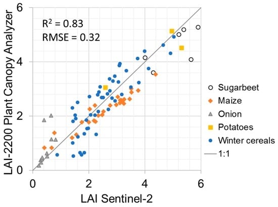 LAI reference measurements were acquired with the Licor LAI-2200 Plant Canopy Analyzer [31] from April to June 2016 over five different crops (Sugarbeet, Maize, Onion, Potatoes and Winter wheat) for a total of 95 measurements. The field measurements were used to validate LAI retrievals from six different Sentinel-2 acquisitions (tile 33UXP) over the study region of Marchfeld [14]. The maximum time span between satellite acquisitions and ground measurements was 6 days (7 April). Results in Figure 10 show a very good agreement (R2 = 0.83) and a RMSE of 0.32 m2/m2 (12% of mean value).