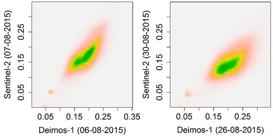 Scatterplots between Sentinel-2 and Deimos-1 broadband HDRF for two different dates.