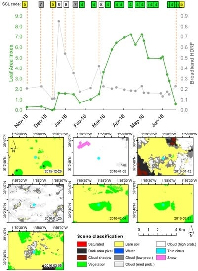 As final check, we looked at time profiles of broadband HDRF, LAI and the scene classification classes (Figure 12). The selected pixel is from cropland located in the Barrax region, Spain, from November 2015 to end of June 2016. We observe a temporal evolution of LAI that is consistent with the crop growing pattern for winter crops. Peaks in broadband HDRF values are consistent with the scene classification.