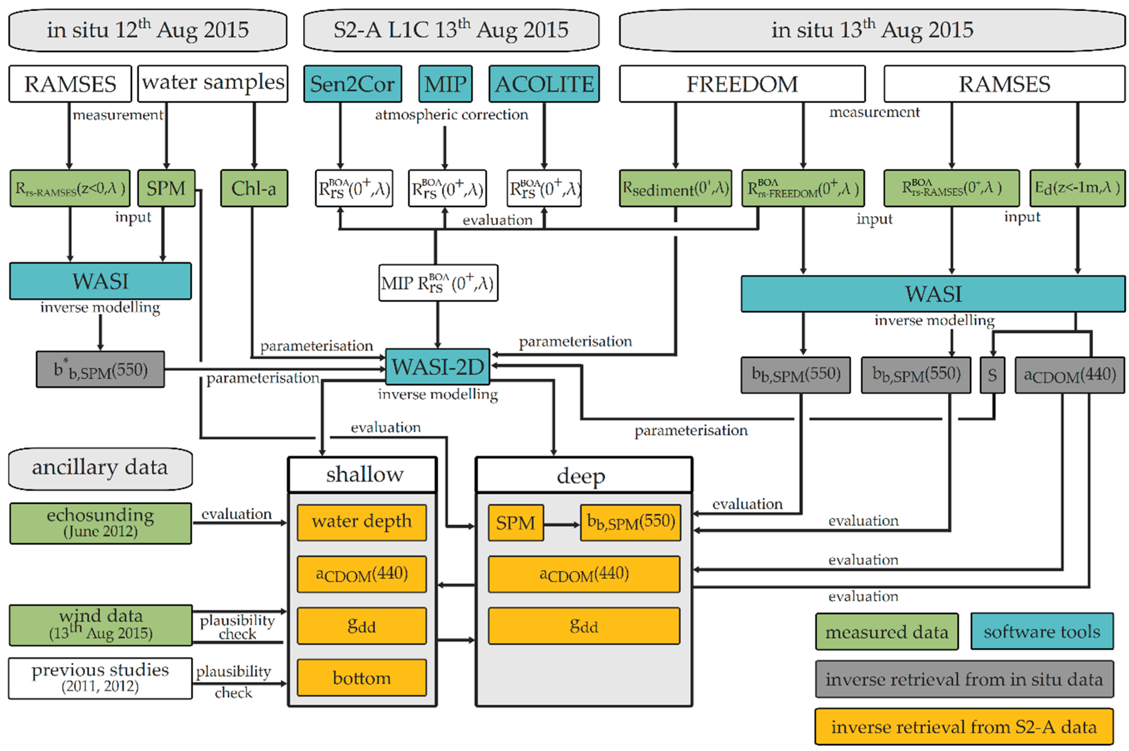 - Gege, P. WASI-2D: A software tool for regionally optimized analysis of imaging spectrometer data from deep and shallow waters. Comput. Geosci. 2014, 62, 208–215. [Google Scholar] [CrossRef]