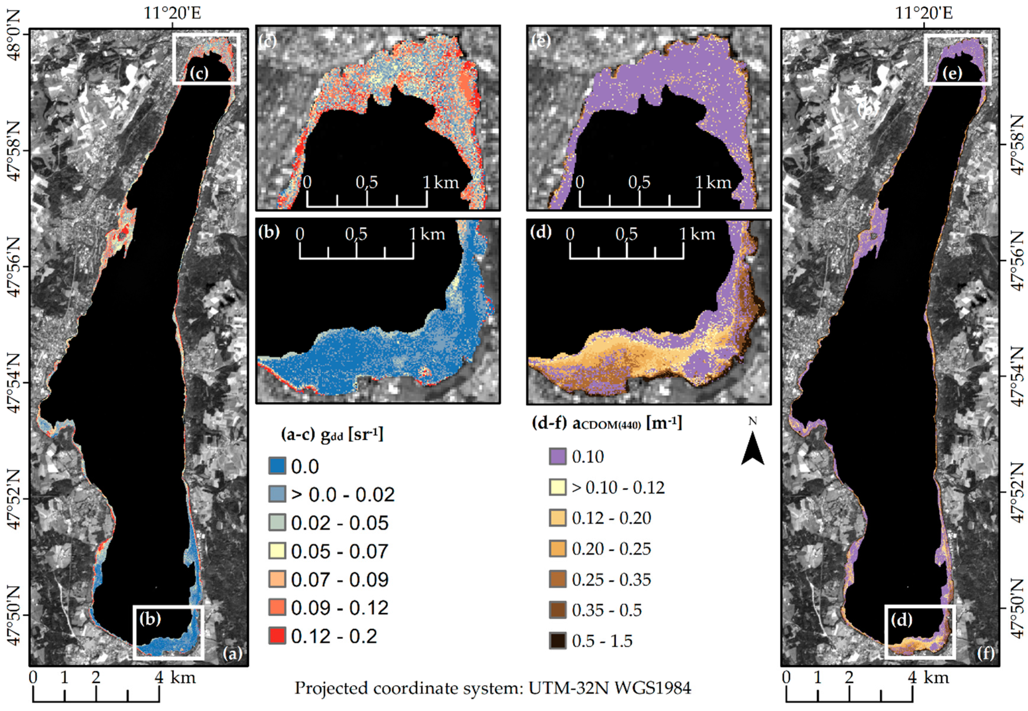 - Dörnhöfer, K.; Gege, P.; Pflug, B.; Oppelt, N. Mapping indicators of lake ecology at Lake Starnberg, Germany—First results of Sentinel-2A. In Living Planet Symposium; Ouwehand, L., Ed.; ESA Communications: Noordwijk, The Netherlands, 2016; Volume 740. [Google Scholar]