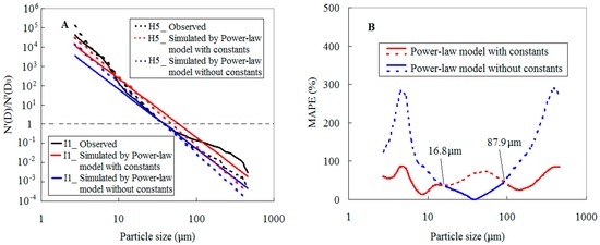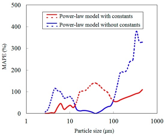 Power-law models with and without the correction parameters are both used to estimate the PSD slopes. Based on Equation (2), the model was generated by the regression analysis between N′(D)/N′(D0) and D/D0.