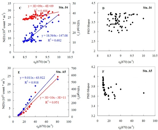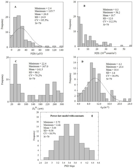 Figure 3 shows the variability in the PSD parameters and the bio-optical parameters, including V(D) (in μL/L), N(D) (in 1 × 1010 count/m3), Dv50 (in μm), PSD slopes, and cp (in m−1), from the cruise (n = 79) in the Bohai and Yellow Seas in November 2013. V(D) varied 57-fold, ranging from 2.4 to 135.7 μL/L, with a mean of 26.0 ± 24.9 μL/L, and most (~70%) in the range of 5–35 μL/L. N(D) also showed relatively large variability, ranging from 0.3 to 58.2 (1 × 1010 count/m3) with its CV of 112.3% and most samples (~73%) in the range of 0–15 (1 × 1010 count/m3). The median particle diameter (50th percentile) of the volume distribution, Dv50, ranged from 22.4 to 307.0 μm, with a non-normal distribution (Figure 3C). The particulate beam attenuation coefficient, cp, varied between 4.2 and 24.4 m−1, with a mean of 10.4 ± 3.8 m−1 and a Gaussian distribution with a relatively small CV (36.4%). Similarly, the PSD slope also showed large variations (Figure 3E).