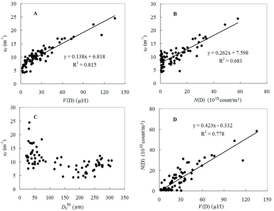 The relationships between the PSD parameters and the bio-optical properties in the Bohai Sea and the Yellow Sea, measured in November 2013 (n = 79): (A) V(D) vs. cp; (B) N(D) vs. cp; (C) Dv50 vs. cp; and (D) V(D) vs. N(D).