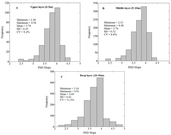 The statistics of the PSD slopes in the: (A) upper layer (0–5 m) (n = 375); (B) middle layer (5–20 m) (n = 1065); and (C) deep layer (20–90 m) (n = 1354) of the water column. These sample numbers were determined by LISST sampling frequency (1 count·s−1) and residence time during the observation period in each specific layer, which is the time required for the LISST to travel down through the upper layer (0–5 m), middle layer (5–20 m), and deep layer (20–90 m).
