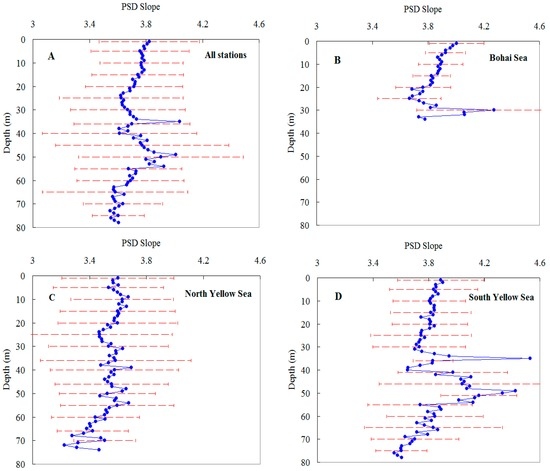 The vertical profiles of the mean and the standard deviation (SD) of the PSD slopes at 5 m intervals: (A) all stations (n = 79); (B) Bohai Sea (n = 20); (C) North Yellow Sea (n = 29); and (D) South Yellow Sea (n = 30). Note that the Bohai Sea is relatively shallow, and the profiles were limited to the first 40 m.